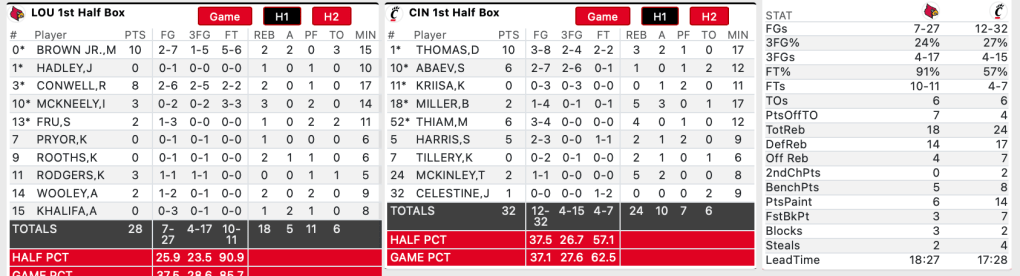 UC wasn’t lights out either (4–15 from three, 12–32 overall), but they were the aggressors. They won the early rebounding battle 24–18, doubled up Louisville in assists 10–5, and matched the Cards with six turnovers. At halftime, both teams had a single scorer in double figures — Day Day Thomas for UC and Mikel Brown for Louisville.